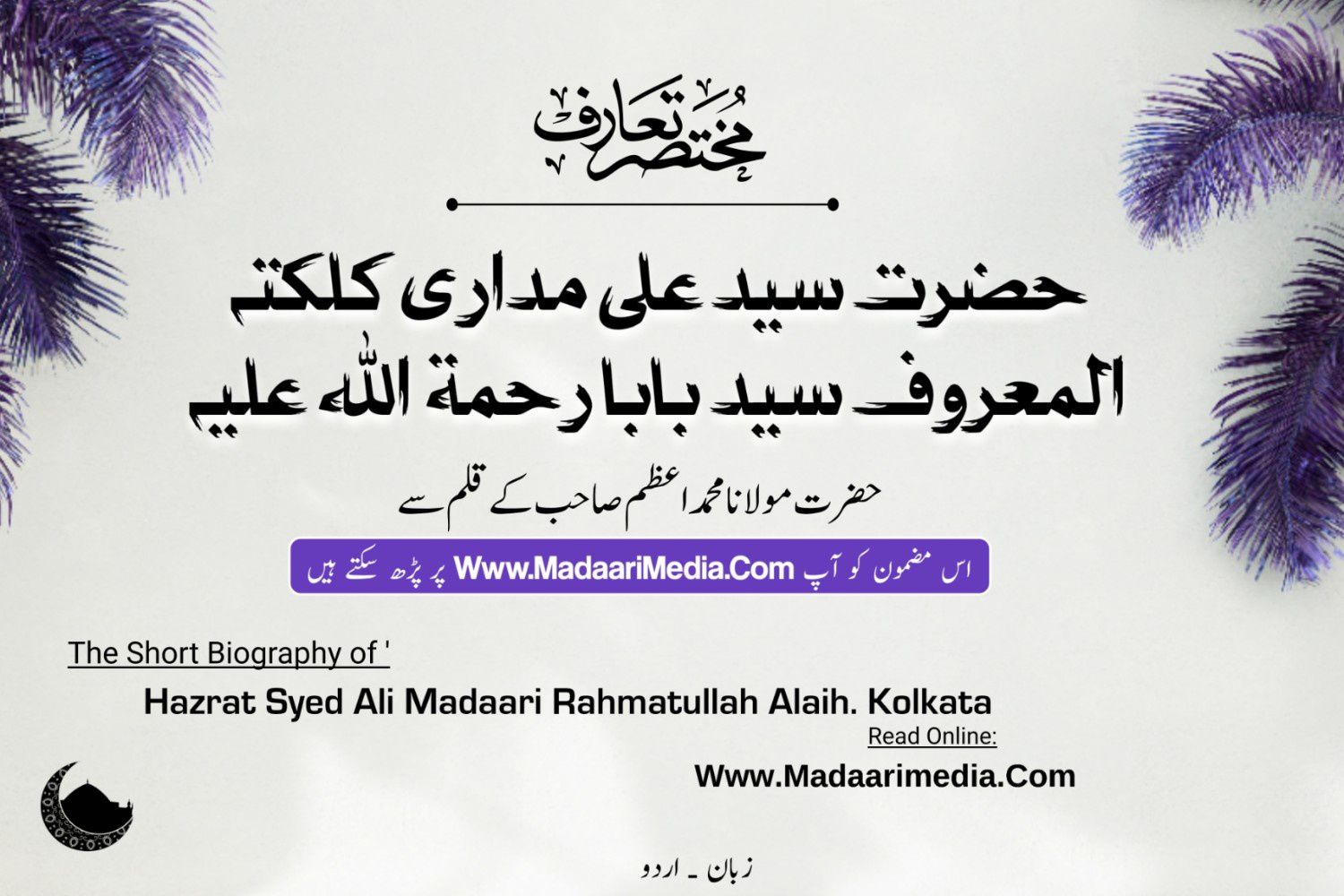ولئ كامل عارف باللہ حضرت سید علی الملقب سید بابا رحمۃ اللہ علیہ اپنے دور کے قطب وقت اور رفیع اور فیض رسان خلق گزرے ہیں۔ موصوف سلسلہ عالیہ مداریہ سے نسبت رکھتے ہیں۔ ہندوستان کے مشہور شہر کولکاتہ میں آپ کی ولادت با سعادت ہوئی۔ آپ کے والد ماجد کا اسم گرامی سید حیات علی اور والدہ معظمہ کا نام … فاطمہ تھا۔ آپ کا خاندان محلہ خضر پور کلکتہ میں ہمیشہ با عظمت سمجھا گیا۔